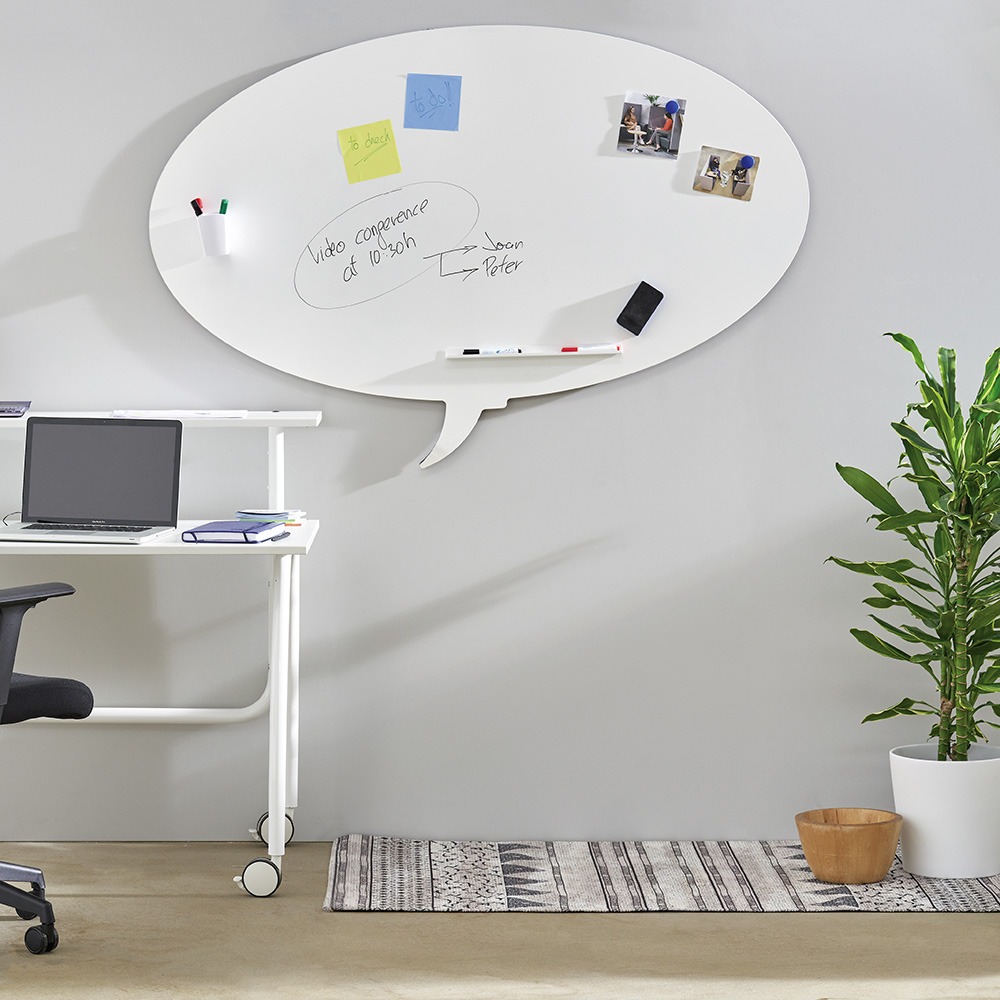 Designová magnetická tabule ve tvaru komiksové bubliny podporující komunikaci a sdílení nápadů. Elegantní bezrámové provedení, snadná montáž, kvalitní lakovaný povrch pro suché stíratelné fixy. Ideální do kanceláří, škol i domácích pracoven.