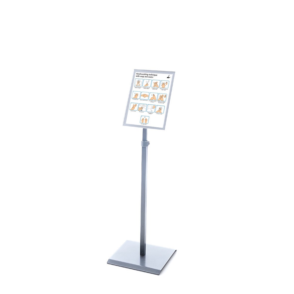 Vďaka plynule nastaviteľnej výške v rozsahu 102 až 150 cm je možné stojan jednoducho prispôsobiť rôznym prevádzkovým situáciám aj výške pozorovateľa. Zobrazovacia plocha otočná o 360° umožňuje rýchlu zmenu orientácie dokumentu a komfortné nastavenie optimálnej polohy bez potreby presúvania celého stojana. Táto flexibilita je ideálna najmä v prostrediach, kde sa informácie často menia.